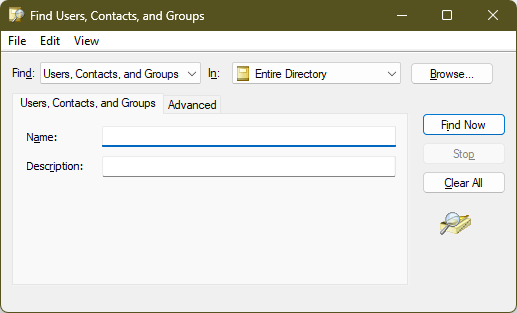 - Click Start Orb Menu, and type %SystemRoot%\SYSTEM32\rundll32.exe dsquery,OpenQueryWindow (I would recommend create a shortcut and place it in programs menu)