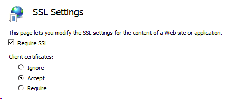 - click on CCM_Client site. On right side pane, double click SSL Settings. Select Accept on Client Certificates: section.
