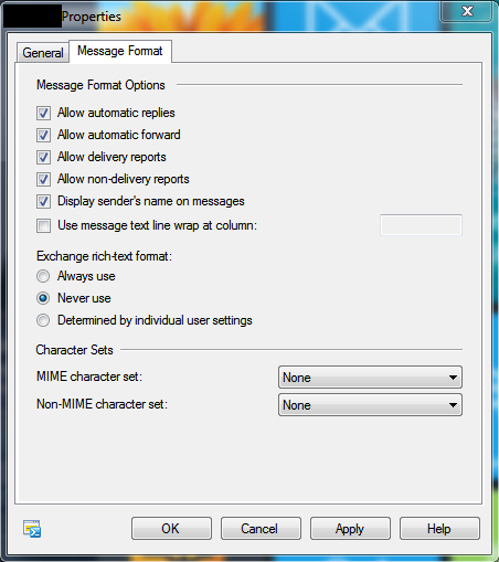 4. Open the newly created remote domain properties, go to Message Format tab and select Never use for Exchange rich-text format. click OK to close.