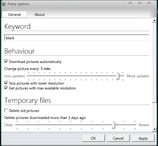 Pulse is an application that automatically downloads wallpapers from the web using given keyword. At this time it uses http://rewalls.com to get wallpapers. There are thousands of beautiful wallpapers with different resolutions. Pulse automatically chooses wallpapers with your screen resolution. You can make it to skip wallpapers with lower resolution or to get wallpapers with original size.