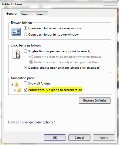 - Check the box for the Navigation pane option Automatically expand to current folder