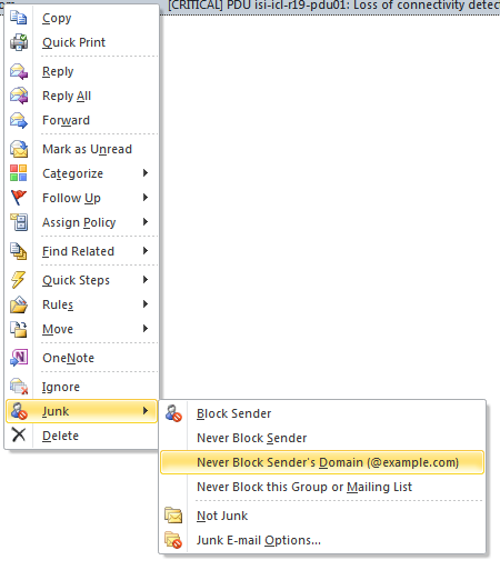 When you have external legitimate email sender’s email address and domains, it may have been end up in Junk E-Mail in Outlook. You can tell users to right click on the email in Junk E-Mail folder and select Junk –> Never Block Sender (or Never Block Sender’s Domain). But every user had to do this by him/herself.