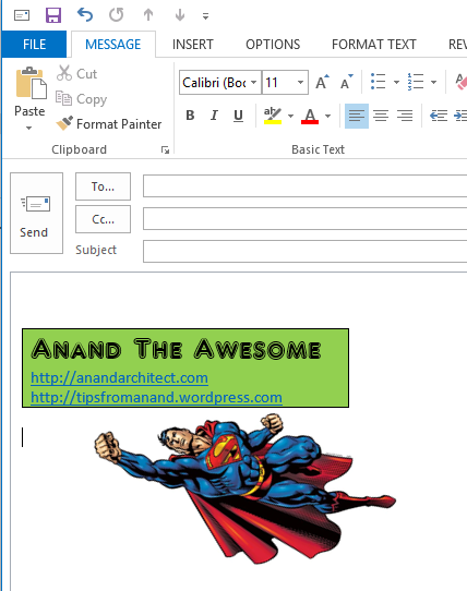 In Outlook 2013 (& 2010) if you paste or insert an picture (e.g., Logo) in Signature Editor, it is not resizable. You are stuck and not able to do a correct sized picture in Logo. But No worries. There is an very simple trick that you can make the signature however you want.