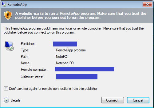 “A website wants to run a RemoteApp program. Make sure that you trust the publisher before you connect to run the program.”