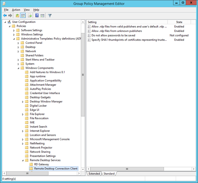 8. Double click on the setting: Allow .rdp files from valid publishers and user’s default .rdp settings.