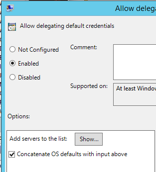 2. Double click on Allow delegating default credentials. Click Show button in Options next to “Add servers to the list”.