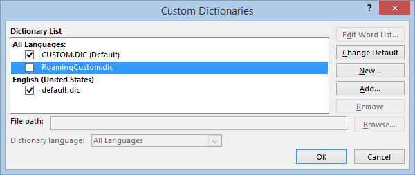 3. Select the CUSTOM.DIC and a Language (English (United States) in my case) if not selected. If you don’t see your language, add it.