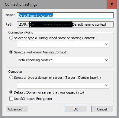 - Right click on ADSI Edit and select “Connect to…”. Choose “Default Naming Context” and click OK.