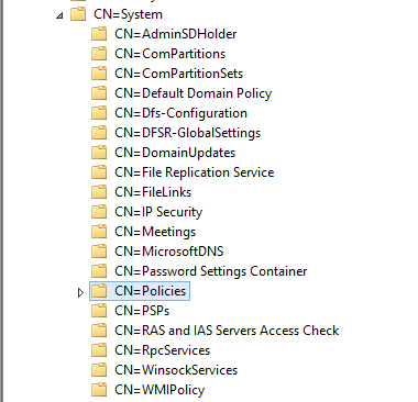 - Expland to ADSI Edit >>> Default Naming Context (domain.com) >>> DC=company,DC=com >>> System >>> Policies
